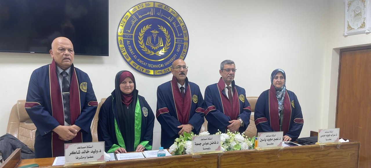 تدريسي من الكلية التقنية المسيب يرأس لجنة مناقشة ر... ترأس أ.د. علاء فاضل عباس التدريسي في الكلية التقنية المسيب، لجنة مناقشة رسالة ماجستير في كلية التقنيات الصحية والطبية / الكوفة، للباحثة زينب فلاح طالب عن رسالته...