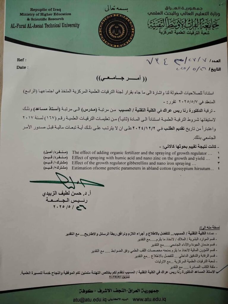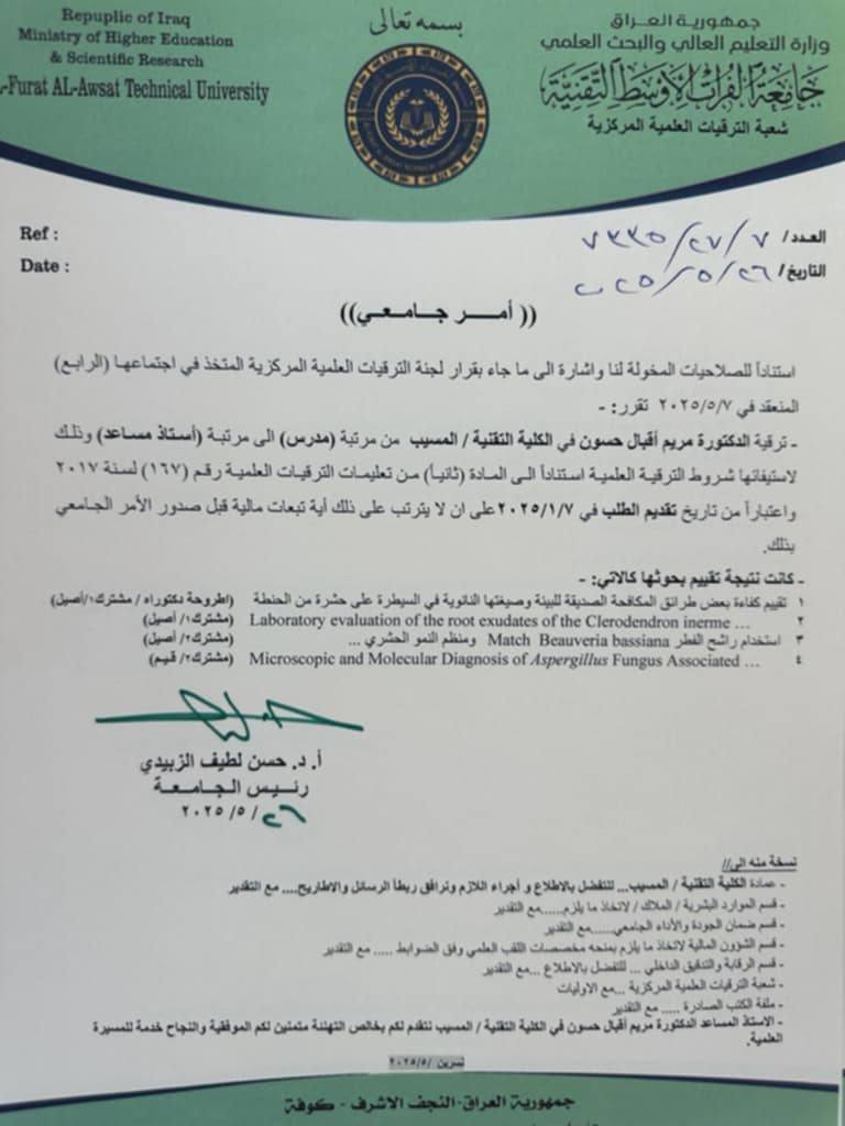 نظرًا لاستيفائهم شروط الترقية العلمية …. تم ترقية التدريسيتان في الكلية التقنية المسيب ،م. مريم إقبال حسون من قسم تقنيات المقاومةالاحيائية، و م. رنا ريس عراك من قسم تقنيات الانتاج النباتي من مرتبة مدرس إلى مرتبة أستاذ مساعد.