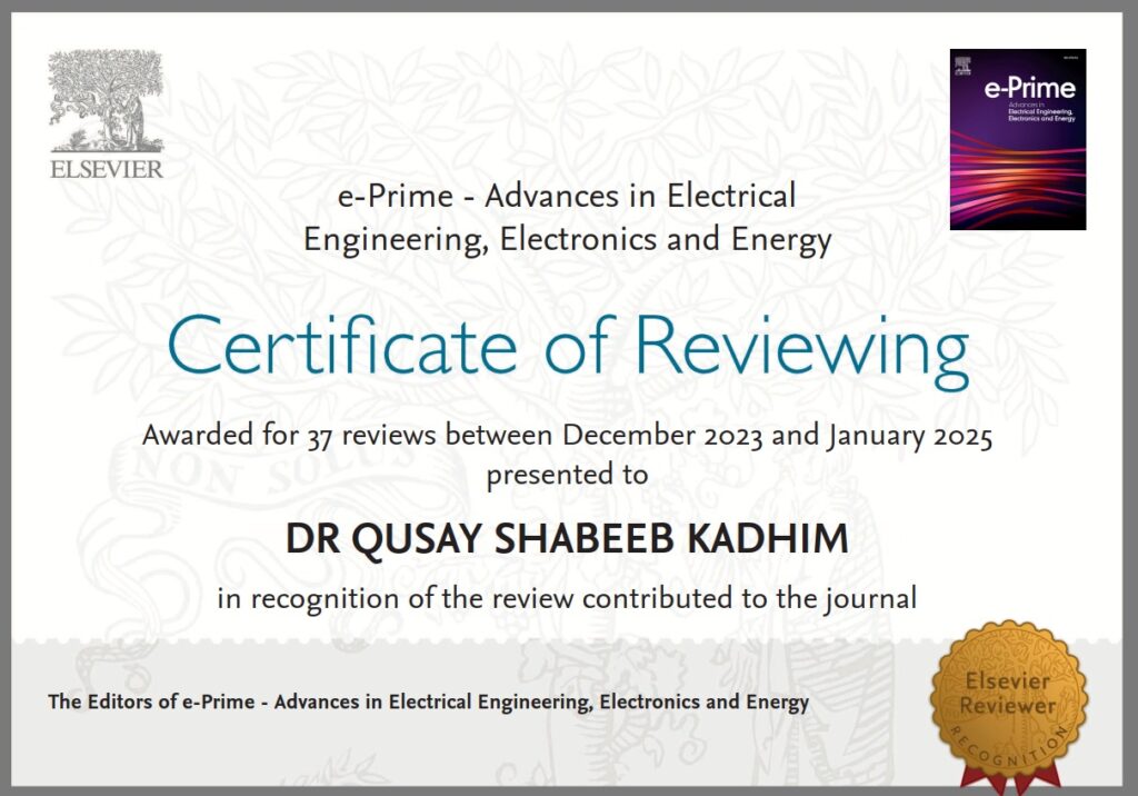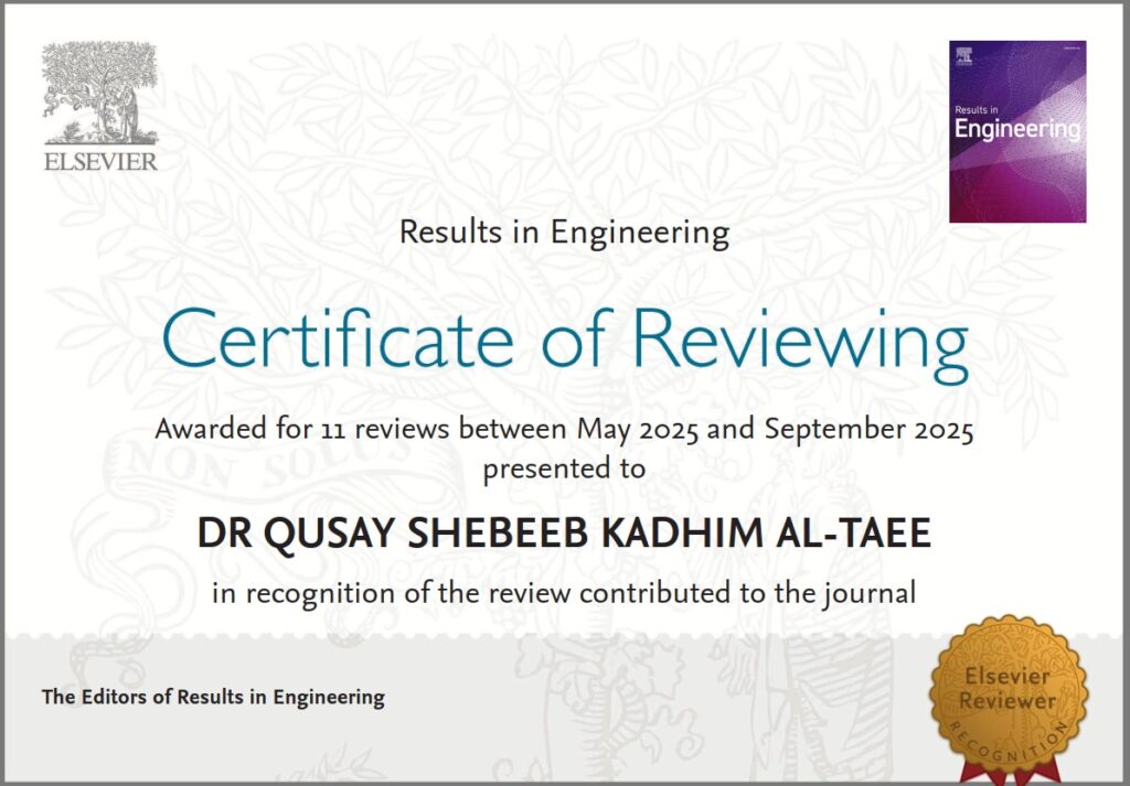 إن إسهام التدريسيين في عمليات التقييم لمثل هذه المجلات عالية التأثير، يعكس المستوى العلمي الرصين الذي يتمتعون به، ويُسهم في تعزيز سمعة الكلية التقنية المسيب وجامعة الفرات الأوسط التقنية ضمن المجتمع البحثي الدولي، فضلاً عن دوره في دعم الانتشار العلمي وتحقيق الأثر الأكاديمي والتطبيقي.