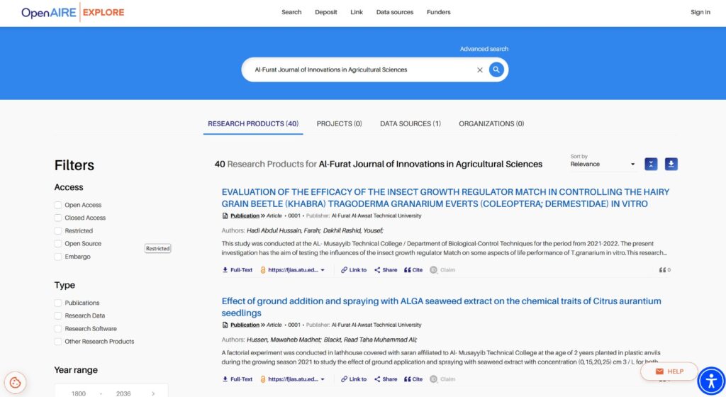 عبر الرابط : – https://explore.openaire.eu/search/find?fv0=Al-Furat%20Journal%20of%20Innovations%20in%20Agricultural%20Sciences&f0=q