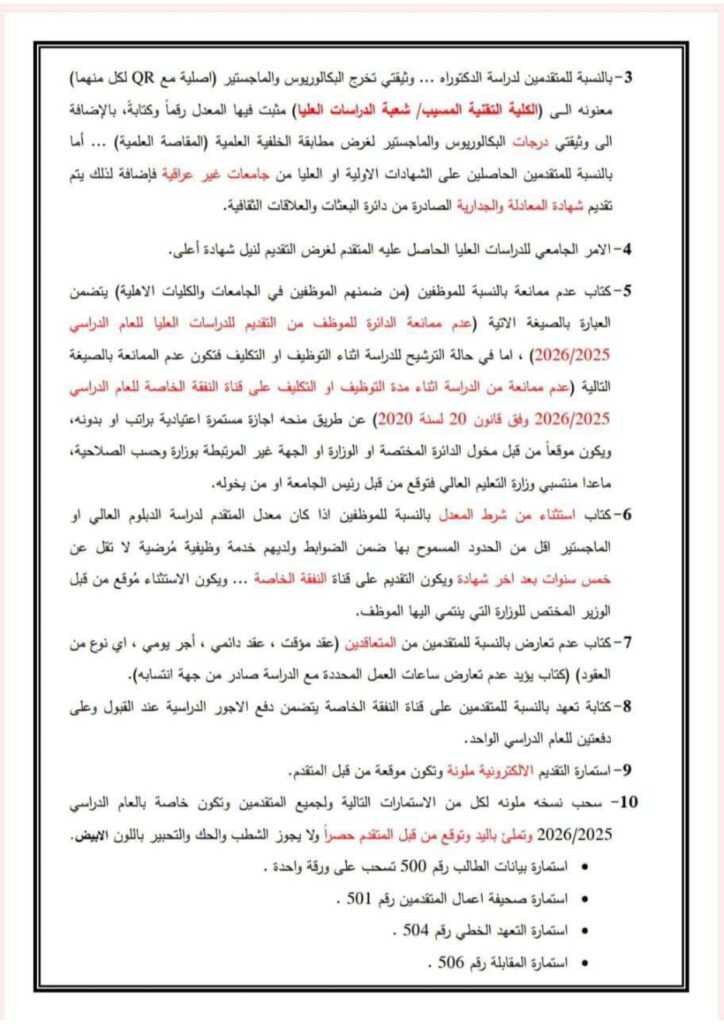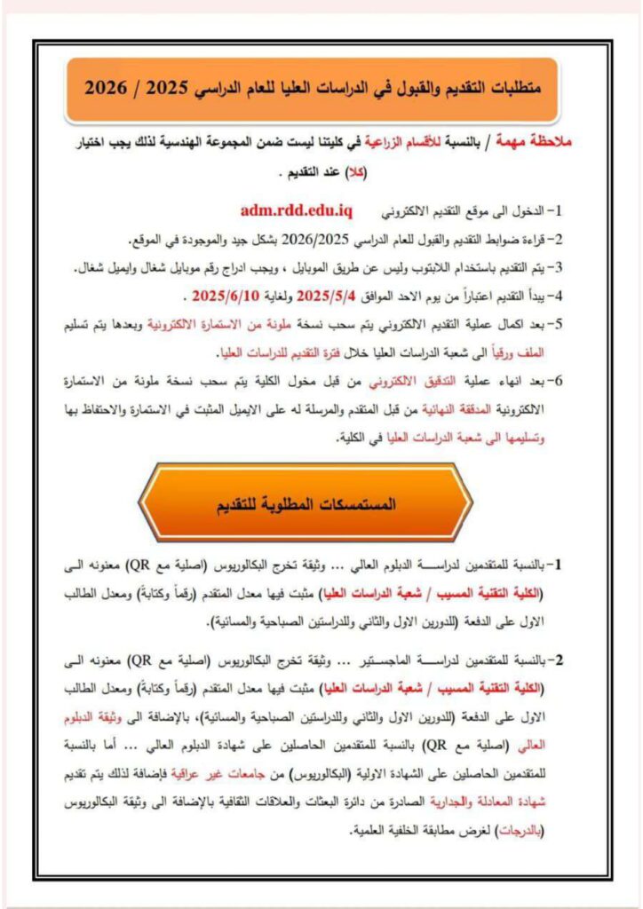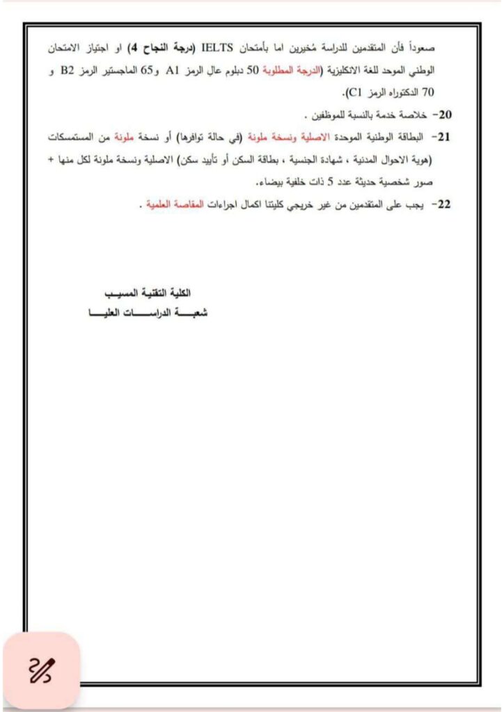 ضوابط القبول للدراسات العليا في الكلية التقنية المسيب للعام الدراسي 2025 /2026